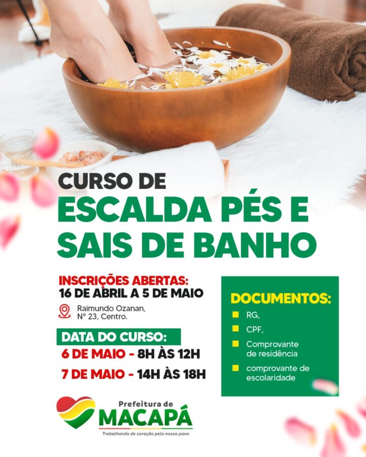 A Prefeitura de Macapá está com inscrições abertas para o curso gratuito de escalda-pés e produção de sais de banho, voltado à capacitação em práticas de autocuidado e bem-estar. As aulas ocorrerão nos dias 6 e 7 de maio, com oficinas presenciais e conteúdo prático.